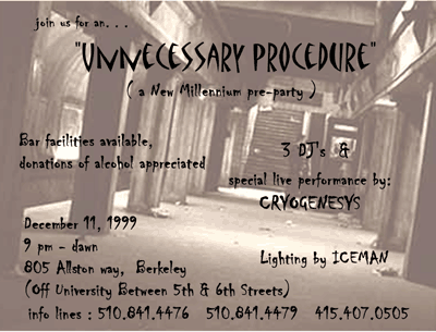 UPCOMING SHOWSAt this time I am semi-retired, I would like to get back into it, but current non-musical projects have kept me busy.PAST SHOWS07.13.01 - DEFCON 9.0 Las Vegas NV, 05.19.01 - Annilation 2001 ! SF, CA. 11.18.00 - Edinburgh Castle, 950 Geary San Francisco, CA 10.28.00 - "Can't Hurt Enough #3, at Hobie's Roadhouse, 2045 Mt. Diablo St., Concord CA 09.28.00 - CD release Party for Wire Graffiti's second album, "HITTING TRAFFIC" 07.30.00 - DEFCON , in Las Vegas ( Pictures HERE ) 06.17.00 - "Can't Hurt Enough" #2, at Hobie's Roadhouse, 2045 Mt. Diablo St., Concord CA. 01.22.00 - "Ground Zero" in Berkeley,CA. 12.31.99 - New Years Eve Party with Catalyst, DJ Dubrock, and Harry Who. 12.11.99 - "Unnecessary Procedure" in Berkeley,CA. 09.25.99 - "Can't Hurt Enough" With KSJO, Lommori Productions, Dudevision Graphics. 06.18.99 -Backup for The CataLyst for their performance at Live 105's BFD at the Shoreline Ampitheater -with Red Hot Chili Peppers, Blink 182, Limp Bizkit, Kid Rock, Sugar Ray, Cake, Smash Mouth, Lit, Moby, Pennywise, Orgy, Silverchair, Lo Fidelity All-stars, The Living End, Imperial Teen, Stunt Monkey, Swingin' Utters, Diesel Boy, Dealership, and Skip Holiday. 12.31.98 Backup for The CataLyst at Origin Rave in Oakland 08.15.98 Backup for The CataLyst at Fedex2 Rave in Oakland CA. - video made at the event - "downtown" (The video says "San Francisco", but was really filmed in Oakland.) 09.13.97 - Chill room DJ - "Electric Highway Tour" Pier 45, San Francisco (as "Iceman" ) With Crystal Method, Fluke, Arkana, DJ Dan, Jeno, DJ Icey, Doc Martin, DJ Sneak, Skylab Soundsystem, DJ Rap, Alfred More, phunck-a-teck - (I got to meet Crystal method back stage - very cool!) 1997 - Various events as resident DJ for Mixman Technologies. |